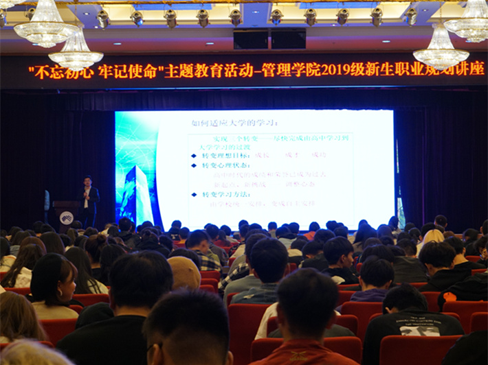 2019年10月16日下午14:00, 管理学院党总支在学术报告厅开展“不忘初心·牢记使命”主题教育之2019级新生职业规划教育。由管理学院党总支书记袁运平主讲,全体辅导员及2019级新生参加。