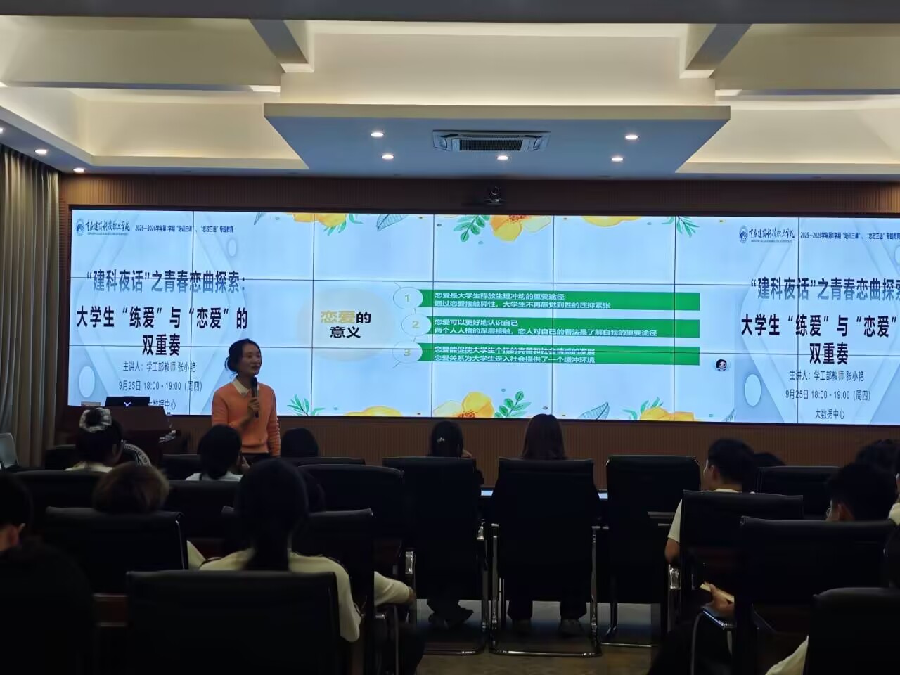 2025年9月25日下午18:00,学校学工部组织的2025-2026学年第一学期“建科夜话”之青春恋曲探索:大学生“练爱”与“恋爱”的双重奏专题讲座在大数据中心举行。本次讲座由学工部教师张小艳主讲,值班书记、辅导员以及在校学生代表共90人共同参加。