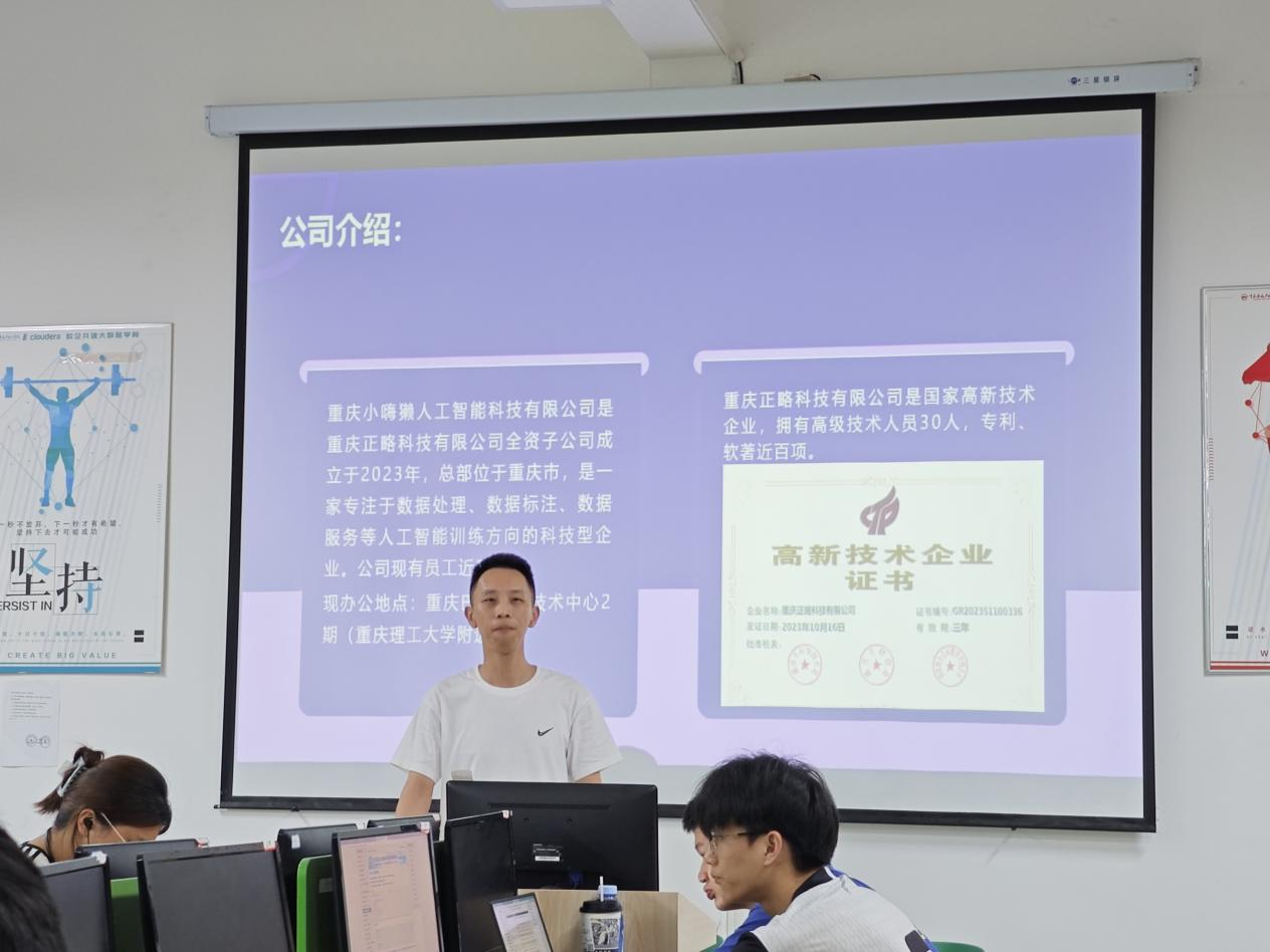 2024年6月18日,一场别开生面的招聘宣讲会在科技楼X-406教室成功举行。此次宣讲会由重庆小嗨獭人工智能科技有限公司(以下简称“小嗨獭科技”)的CEO应总亲自主持,旨在向大数据技术专业的同学们介绍公司的发展前景、招聘岗位及人才培养计划。